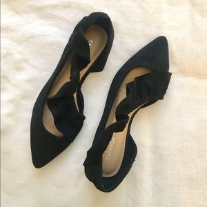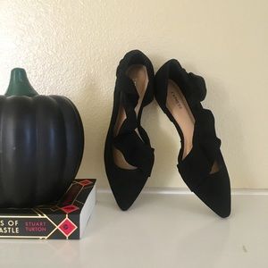size 6 pointed toe flats in suede with a fun ruffle design. Simple, stylish essential that completes the look of a cute little dress or skinny pants ensemble!