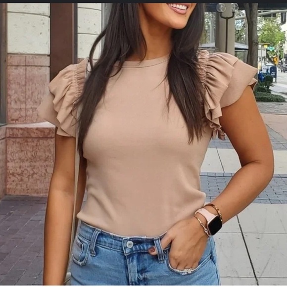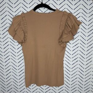 Express Ruffle Short Sleeve Fine Rib Tee Blouse Tan Camel - Small