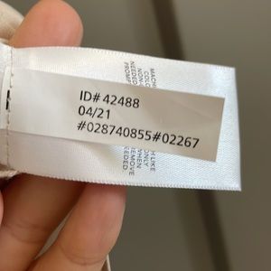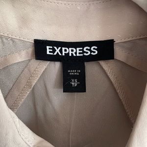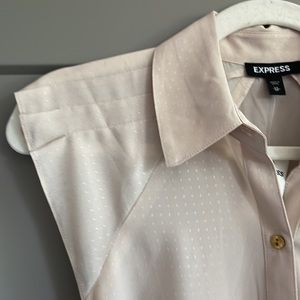 Sold out slinky top in champagne rosy beige with gold textured buttons. Feminine and professional folded ruffle detail at shoulders. Pointed collar and rounded hem. Perfect for office or date night!