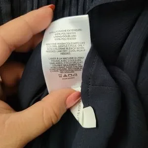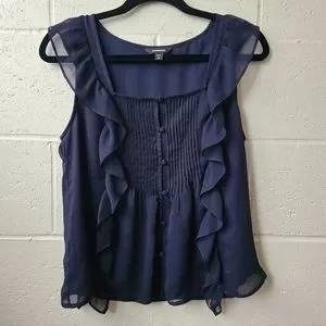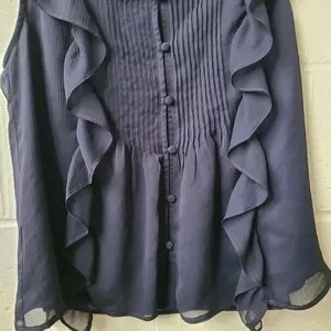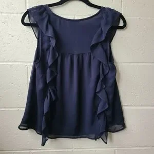 Notes: Never worn. Cute ruffle tank top. It has an inner lining and the button front has a backing so you don't have to worry about skin showing. It's 100% polyester and falls nicely! It's bra friendly (you don't have to worry about your straps showing!) I fit this as a 32A/B (looser fit) and 34 A/B (tighter fit). The last photo shown in white is an example of what it may look like on, although the white is cotton so it doesn't look as elegant as this dark blue. No damages or flaws that I could find.
