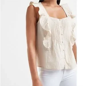 FEATURES & FABRIC: Square neck; Sleeveless with ruffle trim | Button front; Pleated front | Straight hem | Textured crinkle fabric | Machine wash| Imported"