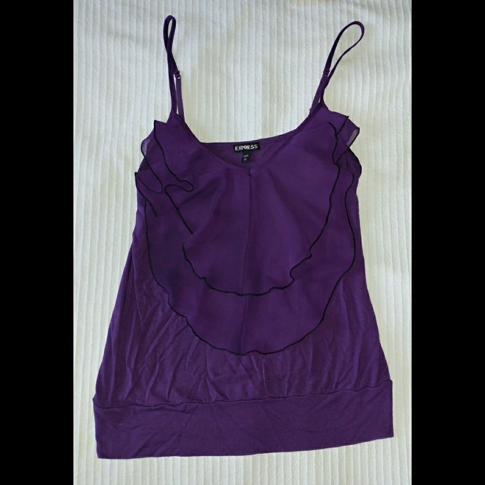 Purple loose fitting tank with elastic bottom, v-neck ruffles and adjustable strap. Looks great under a blazer.