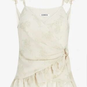This elegant cream wrap top features delicate ruffles and a flattering fit. Perfect for any occasion, it adds a touch of sophistication to your wardrobe.
