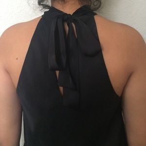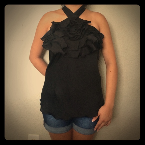 Black, medium, 100% polyester. Fun ruffles in front, tie back keyhole, and slightly ruffled trim. Only worn twice.