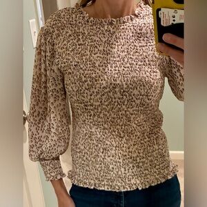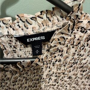 Stylish blouse with ruffled neckline and sleeves. Features an animal print design and a button closure on the neck in the back. Perfect for versatile styling. Runs a little on the small side, so while the size is medium, it is more like a small. Good used condition.