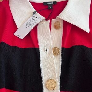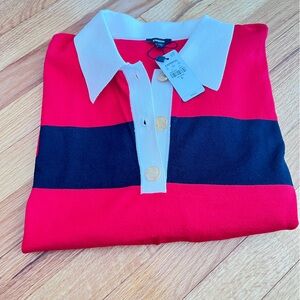 Bold oversized rugby shirt-sweater with red and black stripes. Features a white collar and gold buttons.
