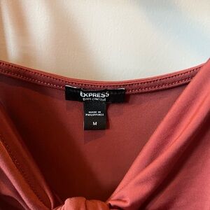 Stylish knot front rust bodysuit. Adjustable spaghetti straps for a sleek look. Removable cups. Silky jersey fabric, doubled layer in front. Bottom snap closure / thong bodysuit. Perfect for layering or wearing alone. Size Medium / Rust color