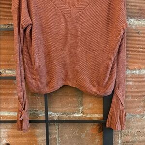 Cozy knit sweater with V-neck. Features long sleeves with tie details. Perfect for layering.