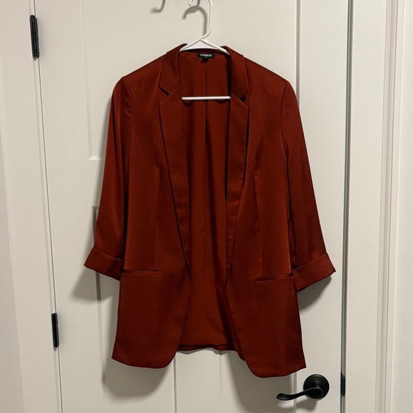Express open-front blazer in a rich rust tone. Smooth satin-like finish. Three-quarter sleeves with cuff detail. Tailored seams for a polished silhouette. Versatile for office or evening looks.