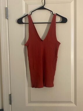Fitted ribbed tank with a deep V-neck. Stretchy knit fabric for a close fit. Solid rust-red shade for easy styling. Simple silhouette that layers well.