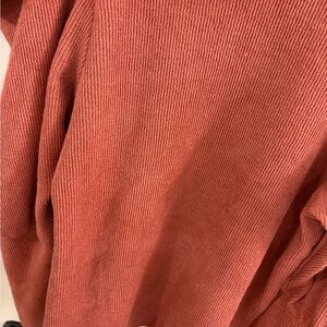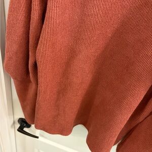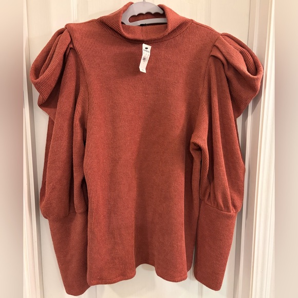 Stylish rust sweater with puff sleeves. Ribbed texture adds elegance.