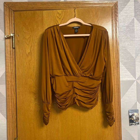 Chic rust blouse by Express. Features a V-neck and ruched design. Ideal for any occasion.
