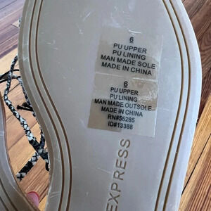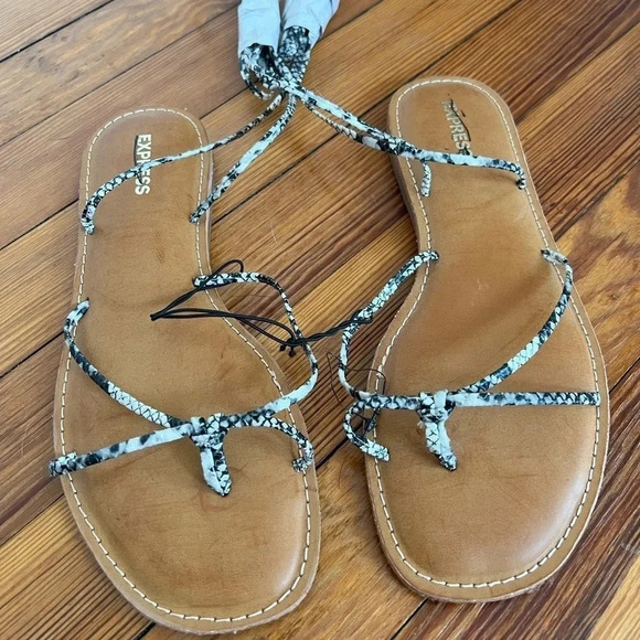 New with tags Express Sandals. These flat sandals are in a snakeskin print. Self tie straps.