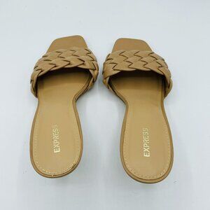 Elevate your style with these Express slip-on sandals in a beautiful brown color. The sandals feature a braided design with an open toe and a stiletto heel, making them perfect for both party and business occasions. The synthetic upper and lining material ensure durability and comfort, while the synthetic outsole provides extra protection. These sandals are layered with accents that add a touch of elegance to the overall look. They are available in women's size 9 and are suitable for summer, fall, and spring seasons.