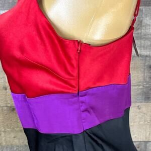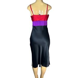 Express Satin Colorblock Tier Cowl Neck Midi Slip Dress. Style# 07876567. Size medium. Color ~ Black, purple, red. Cowl neck. Sleeveless. Adjustable spaghetti straps. Side slits. Straight hem; Midi length. 3 tier color block design. New with tags. Measurements are in the pictures.