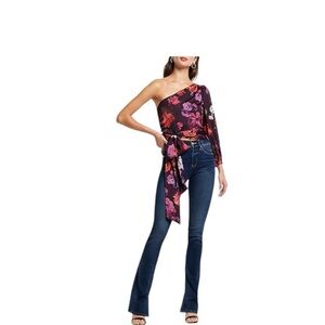 A stunning blouse with a bold floral print, chic one-shoulder puff sleeves, and a flirty side tie waist. The perfect top for brunch, a date night, or a weekend.