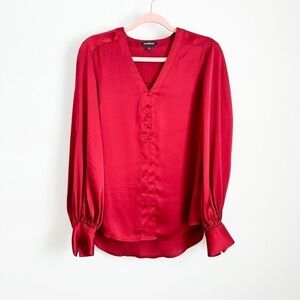 Express Satin Silky V neck Button Detail Balloon Sleeve Blouse Top Crimson Med