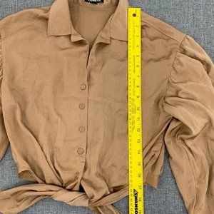 Express Satin Tie Front Cropped Blouse Collared Button front Long Balloon Sleeve