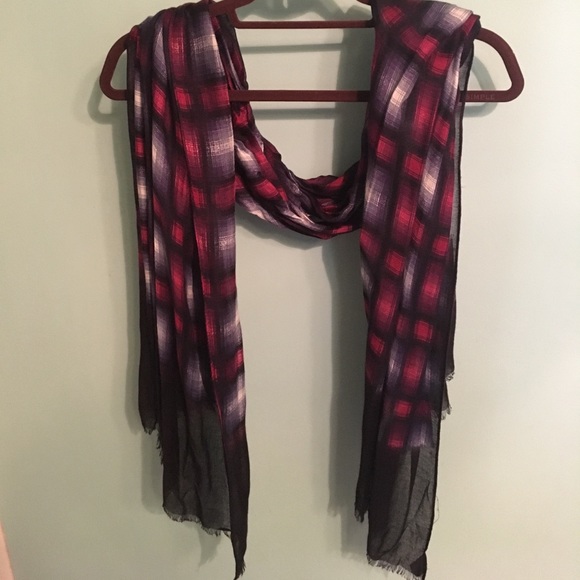 Worn once maybe? Dark dark blue on ends and pinks and navy plaid pattern, lightweight scarf
