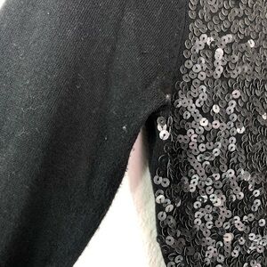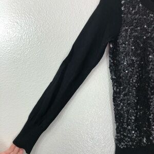 A soft black sweater with a sequin design on the front. Little pilling under the armpits probably from rubbing on the sequins. So comfy even with the front design.