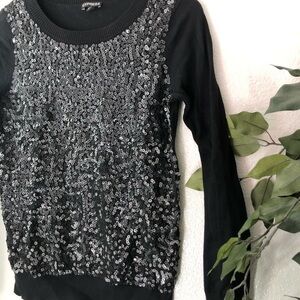 A soft black sweater with a sequin design on the front. Little pilling under the armpits probably from rubbing on the sequins. So comfy even with the front design.