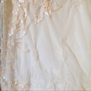 Creamy off white with champagne and pale pink sequins and embroidery. Beautiful hint of femininity . Will look great under blazer or with jeans...maxi skirt etc. worn maybe once. Excellent condition. Pretty piece