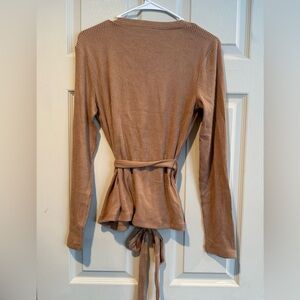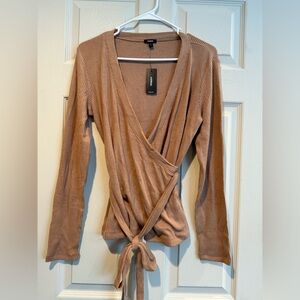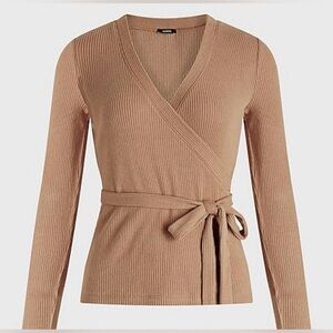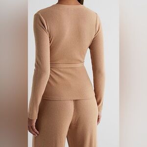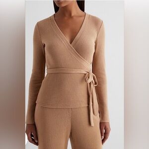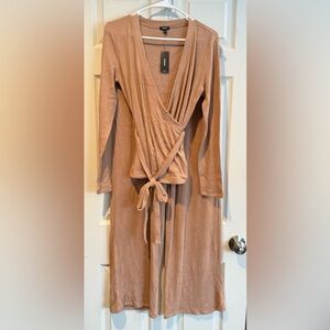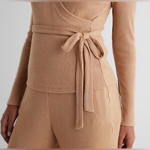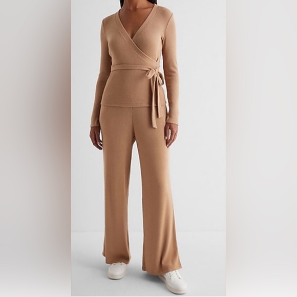 Super cute set from Express. This set inc a faux wrap top with a V necklines and self tie belt. Pull on wide leg pants with an elastic waistband and side pockets. Ribbed . NWT