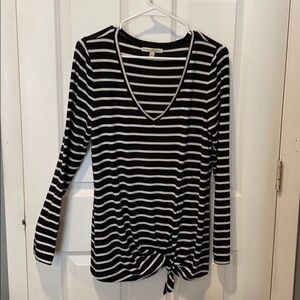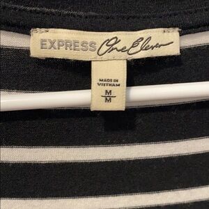 Size medium and fits true to size tunic length tie knot front V Neck from Express One Eleven. Super soft stretchy fabric, black and white striped. Great wardrobe basic. Sexy fitted shape.