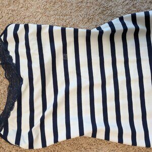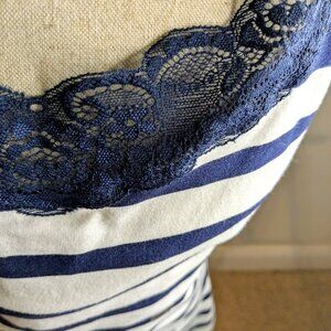 NWT Express Sexy Stretch tank top in Navy Stripe on White with lace V neck in Small. Adjustable spaghetti straps. Soft fabric