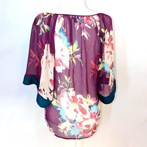 Express | Sheer Kimono Sleeve Purple Tropical Floral Print Blouse | Size Small