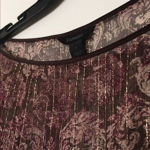 Beautiful flowy oversize semi-sheer blouse. Large open sleeves, Satin trim at bottom with large sash to tie at waist. Deep maroon/dark brown color with abstract print and gold shimmery pinstripes on front and back. Size is "small" but fits more like a medium. Great condition, never worn.