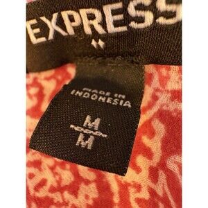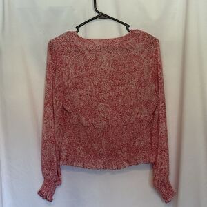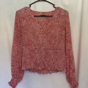 Lightweight and effortlessly chic, this Express women's blouse features a sheer dark pink and white paisley print with button front detail. The flowy design includes smocked cuffs and a subtle ruffle hem for a flattering boho vibe. Perfect for work, casual days, or pairing with jeans for a relaxed look. Very good condition from smoke free home.