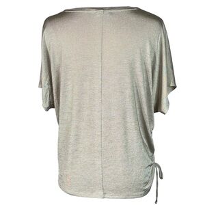 Add a touch of shine and effortless glam to your wardrobe with this Express shimmery champagne taupe short sleeve top. Crafted from a lightweight stretch blend of 97% polyester and 3% spandex, this top drapes beautifully while offering soft comfort and flexibility. It features a deep V-neckline, relaxed dolman sleeves, and a stylish adjustable ruched side with drawstring detail that adds a flattering, customizable shape. The subtle metallic shimmer woven into the fabric makes it perfect for both casual and dressy occasions.