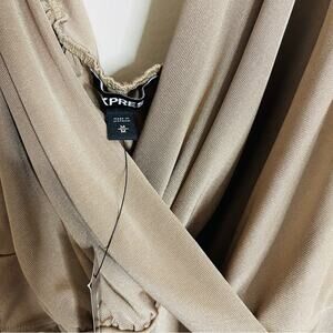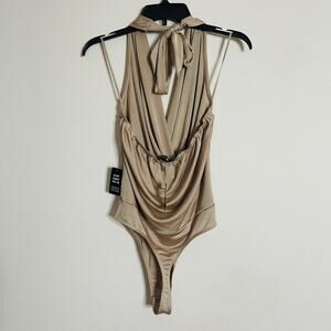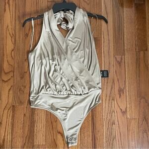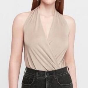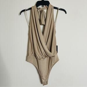 Express Shiny Halter Neck Wrap Front Bodysuit Thong Tan Gold Size M
