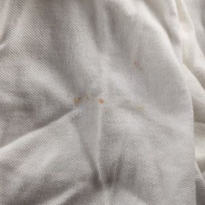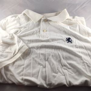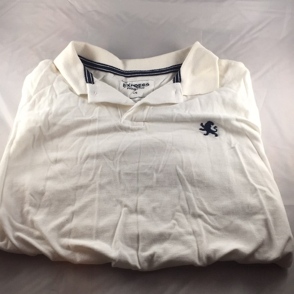 White and black Express polo LG the shirt has a small stain on the right sleeve as seen in the photo