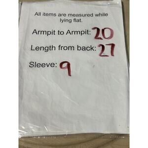 Measurements (lying flat): Armpit to armpit 20 inches, length from back 27 inches, sleeve 9 inches