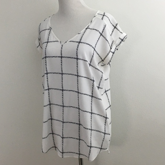 White & black plaid short sleeve top. Has v-neck, cuffed sleeves & round hem. Content is 96% Polyester & 4% Spandex. Measurements flat are approximately 18” pit to pit & 27” long. In excellent preowned condition with NO spots or damage.