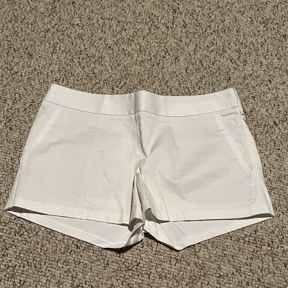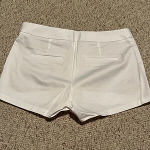 Express Shorts. Slightly dressier shorts. White with tan pockets on the inside, size 0. These have pockets and a side zipper with a U hook. Has fake pockets in the back. There is a small spot on the front as shown in a picture. I don’t think these have ever been worn And an excellent condition
