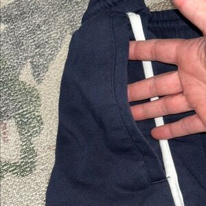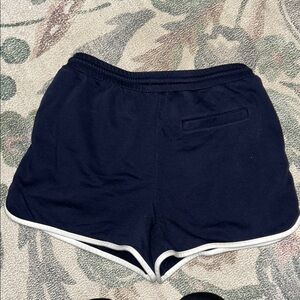 Comfortable navy blue athletic shorts with stylish white accents. Ideal for workouts and casual wear.