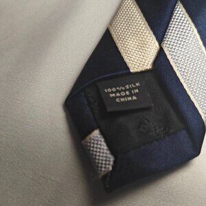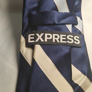 This Express necktie is made of 100% silk in a striped pattern with white and blue colors. It is a long tie, designed for a modern and office theme. The tie is of designer style, made of woven fabric, and is suitable for men's attire.