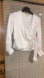 Elegant cream wrap blouse with a stylish tie detail. Perfect for any occasion. Subtle peasant style sleeve cuff. The tie drapes through a loop on the side of the top and features a snap button to hold in place. Women’s size XS. Excellent preowned condition with no holes or stains and smoke free.
