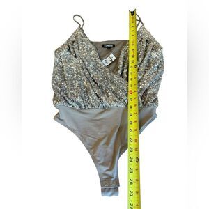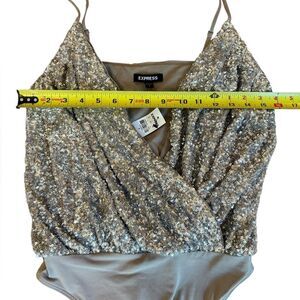 Express Silver Gold Sequin Bodysuit Fuax Wrap Adjustable Straps Womens Small NWT