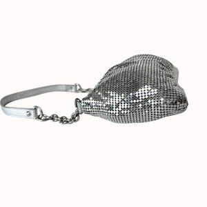 The shimmering silver mesh exterior of this bag reflects light like the stars on a clear night. The sturdy chain strap adds a touch of edgy sophistication, making it a versatile accessory for evening outings. A compact design ensures it holds your essentials while keeping you chic and radiant.