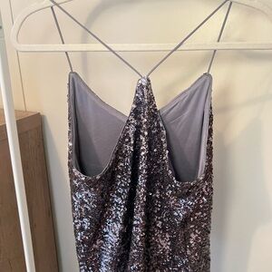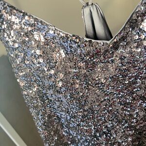 Shimmering silver sequin top with spaghetti straps. Perfect for a night out.