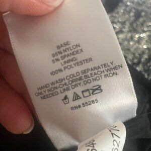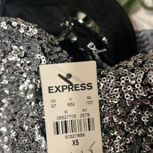 This glamorous sleeveless crop blouse from Express features a dazzling silver sequin design that catches the light beautifully. Its fitted silhouette and rounded neckline make it a chic choice for any special occasion, ensuring you stand out with its shimmering appeal. Has shoulder pads