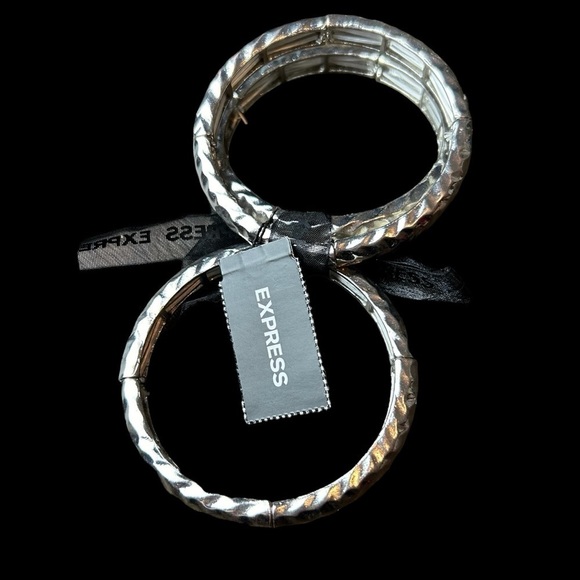 Express trip hammered type textured look silver toned trio of stretch bracelets that make an easy to wear statement piece. These bracelets are stretchy for easy and comfortable on off wear and come in a trio tied with a pretty black Express bow that makes it a perfect gift for yourself or your fashion forward friend or family member! NWT the bracelet is ( unstretched ) approximately 2 1/2” opening and slightly under 2 3/4” from the outside diameter. Awesome idea for a Mother’s Day gift!