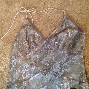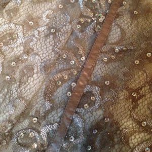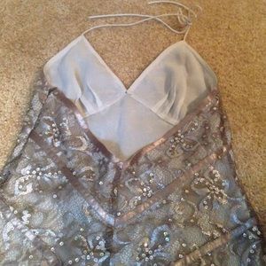 Gorgeous lace overlay, silver ribbon seams are super flattering going both vertically and give great shape to bust and waist. Ties at neck and is a V in the back. Lined. Zips up left side. Shoes and coach wristlet also listed.