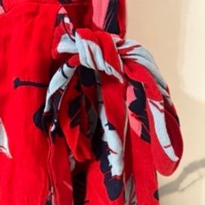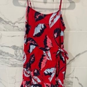 Express Size M summer dress in red, navy, and light blue with floral leaf print. Perfect for summer with adjustable straps and stretchy back. Tie on the side that can be worn around the waist or tied at the hip. Ruffle detail on the bottom and front.