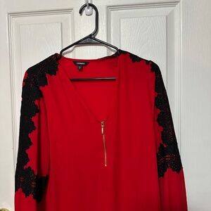 Express size medium vibrant red long sleeve blouse with black lace detailing. V neck with a 3/4 zip on neckline.