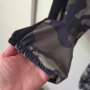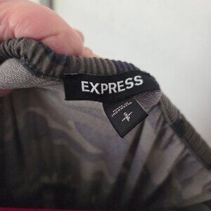 Express size small strapless green camouflage pant jumpsuit. Features elastic at the top, waist, and ankles, black stripe down the sides, and two pockets. There’s also a tie at the waist so you can adjust the fit if necessary. 94% polyester, 6% spandex. Great condition. No signs of wear or damage. Measures approx. 12.25” across the top (flat, unstretched), but has lots of stretch, 14” across the waist (flat, unstretched), 11” rise, 29” inseam, and 48.25” length.